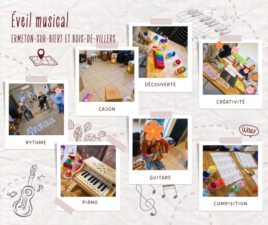 Les ateliers permettent d’explorer le rythme avec des instruments simples comme cajons, maracas ou cloches, et d’apprendre le nom des notes en s’amusant. En plus, les enfants pourront découvrir les joies de la guitare et du piano, pour s’initier aux instruments de manière progressive et amusante. Tous les jeux et activités sont basés sur les chansons choisies par les enfants, de Pat’Patrouille à La Reine des Neiges, pour un apprentissage motivant et joyeux. Vous pouvez rejoindre le groupe à tout moment. Les ateliers se déroulent actuellement à Ermeton-sur-Biert les samedis et au Bois-de-Villers les mercredis. 📍 Ermeton-sur-Biert Rue Germensau 16 5644 Mettet (Salle Les Petits Bonheurs, anciennement la salle de football) 📍 Bois-de-Villers Rue Jules Borbouse 47 (Derrière la salle, dans le local des scouts) ⚠️ Ateliers solidaires Ces ateliers peuvent être proposés gratuitement aux enfants placés en centre de jour ou en orphelinat. Si vous êtes éducateur et souhaitez faire découvrir la musique à un groupe d’enfants, n’hésitez pas à me contacter !